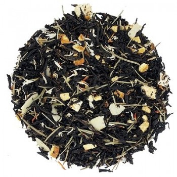 Ingredients: Ceylon black tea, orange peel, almonds, cinnamon, spruce needles, peach, saflor, white cornflower, aromas