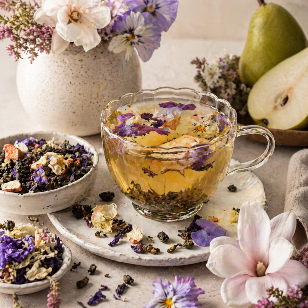 Dry ingredients: Oolong tea, dried pear, strawberry leaf, tri-colored violet, blossom, magnolia flower, natural flavor