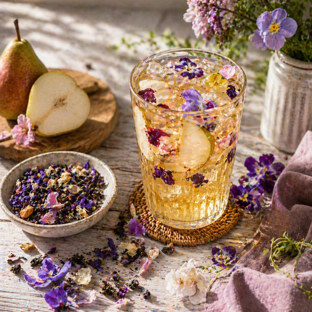The chilled brew served with ice cubes and a slice of pear makes a light, fresh and very elegant version for warmer days.