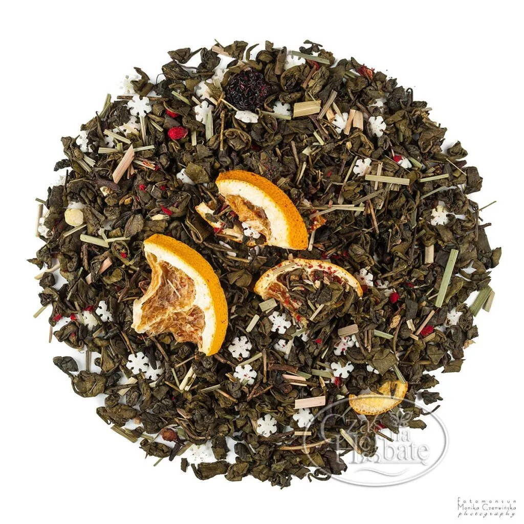 Zielona herbata Gunpowder z dodatkiem cukrowych płatków, pomarańczy oraz...