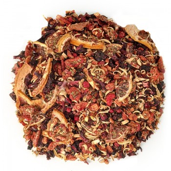 Wygląd: Kolorowa, apetyczna mieszanka suszonych owoców i kwiatów: głęboka czerwień hibiskusa, ciemne porzeczki, kawałki pomarańczy i subtelne płatki kwiatów tworzą barwną kompozycję. Po zaparzeniu napar zyskuje intensywny rubinowo-czerwony odcień, przypominający klasyczne, owocowe drinki – ale w wersji, którą można pić o każdej porze.
