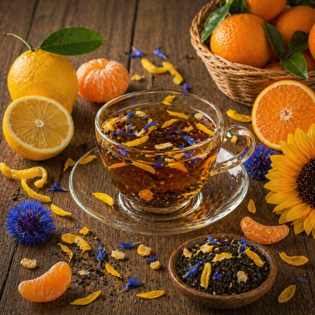 Wygląd: Mieszanka prezentuje się niezwykle efektownie – ciemne liście czarnej herbaty przeplatają się z jasnożółtymi płatkami słonecznika, intensywnie niebieskim bławatkiem oraz kawałkami skórki cytrynowej, tworząc barwną i apetyczną kompozycję.