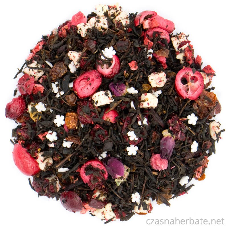 Składniki: herbata czarna OP, skórka owocu dzikiej róży, cukrowe płatki śniegu (cukier, maka ryżowa, tłuszcz kakaowy, substancja zagęszczająca (tragakanta), truskawka liofilizowana, żurawina liofilizowana, wiśnia liofilizowana, jabłko liofilizowane, hibiskus, róża pąki, aromat
