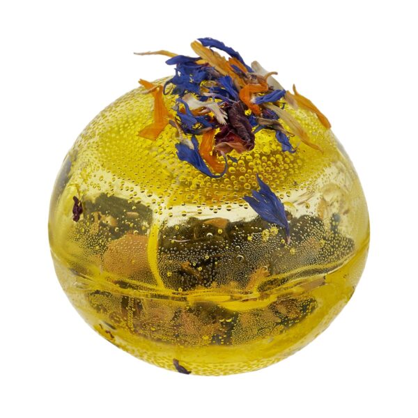 W środku kuli znajduje się porcja przepysznej, zielonej herbaty, którą charakteryzuje aromat wiśni, ananasa i delikatne nuty jaśminu. Porcja suszu zamknięta jest pięknej kuli w żółtym kolorze. Kula została stworzona z Izomaltu, który dzięki swojej słodkości uzupełnia smak mieszanki, tworząc idealny duet. Izomalt to środek słodzący, charakteryzujący się niską kalorycznością. Często występuje jako zamiennik cukru w słodyczach i innych produktach spożywczych.