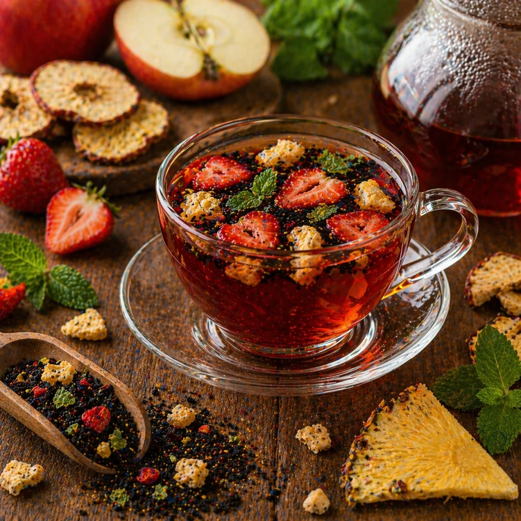 Wygląd: Elegancka, kolorowa mieszanka – ciemne liście czarnej herbaty kontrastują z jasnymi kawałkami suszonego jabłka, naturalnie nieregularnymi fragmentami truskawki i ananasa oraz zielonymi liśćmi melisy. Całość wygląda naturalnie i apetycznie.