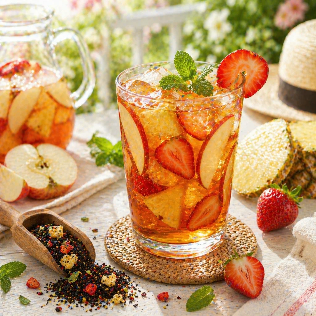 Orzeźwiająca odsłona herbaty, idealna na cieplejsze dni. Schłodzony napar w połączeniu z lodem oraz soczystymi kawałkami jabłka i ananasa tworzy lekki, naturalnie słodki napój, który nie tylko gasi pragnienie, ale też dostarcza przyjemności przy każdym łyku. To doskonała alternatywa dla klasycznych, słodzonych napojów.