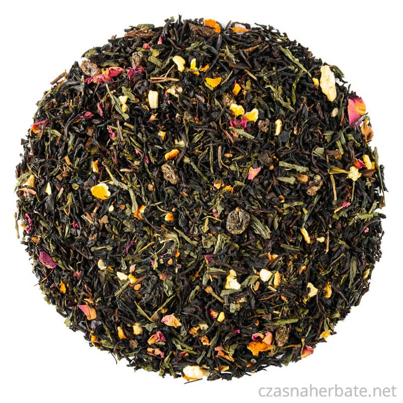 Składniki: herbata czarna OP, herbata zielona Sencha, rodzynki (rodzynki, olej roślinny), skórka pomarańczowa, cynamon, płatki róży, aromaty