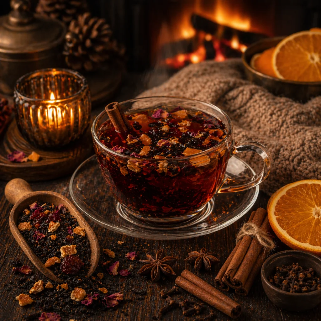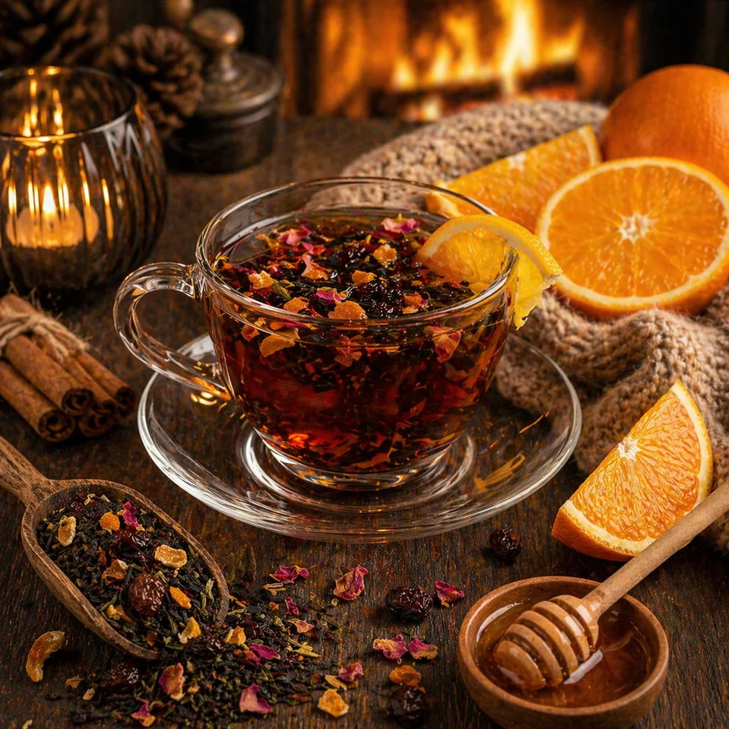 Wygląd: Bogata, naturalna mieszanka – ciemne liście czarnej herbaty i zielone igiełki Senchy przeplatają się z kawałkami pomarańczy, rodzynkami, cynamonem oraz różowymi płatkami róży. Kompozycja jest kolorowa, przytulna i bardzo „jesienno-zimowa”.