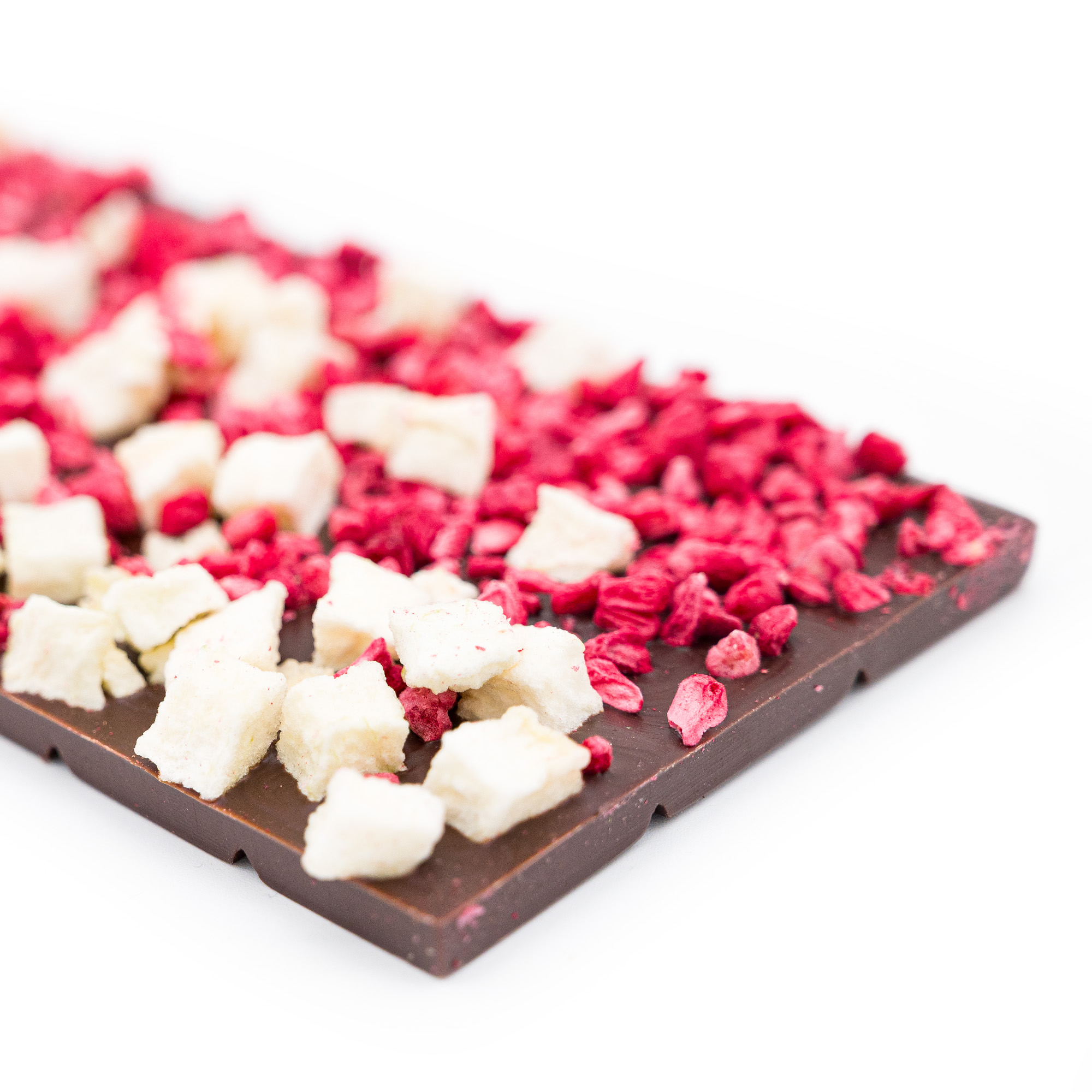 Składniki: czekolada (miazga kakaowa, cukier, masło kakaowe, emulgator: lecytyna sojowa, aromat naturalny - wanilia), malina liofilizowana 5%, jabłko liofilizowane 5%. Masa kakaowa w ciemnej czekoladzie min. 60%.