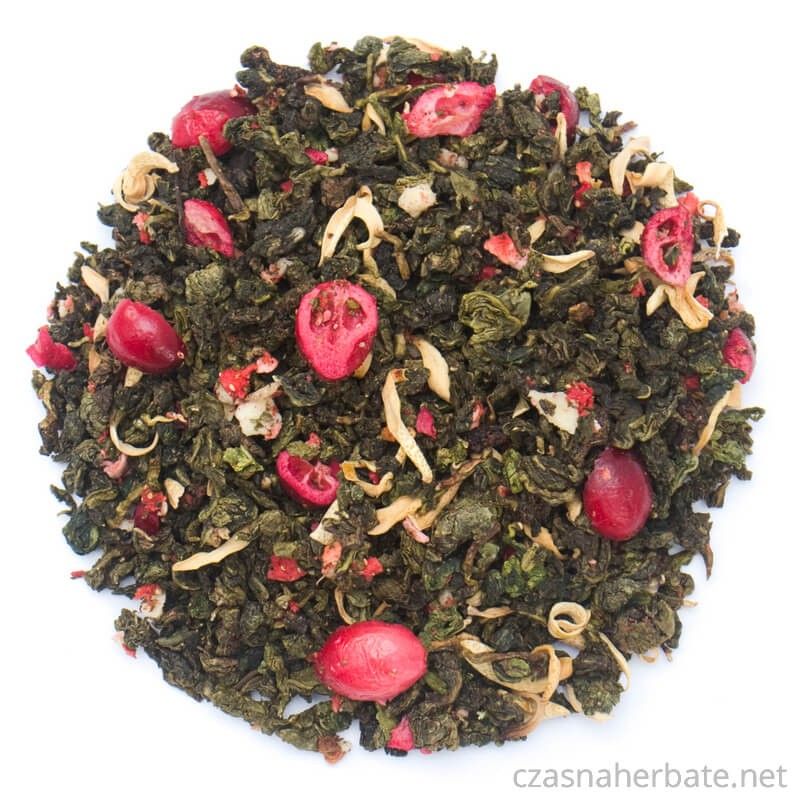 Składniki: herbata Oolong, żurawina liofilizowana, truskawka liofilizowana, jabłko puffing, kwiat pomarańczy, aromaty