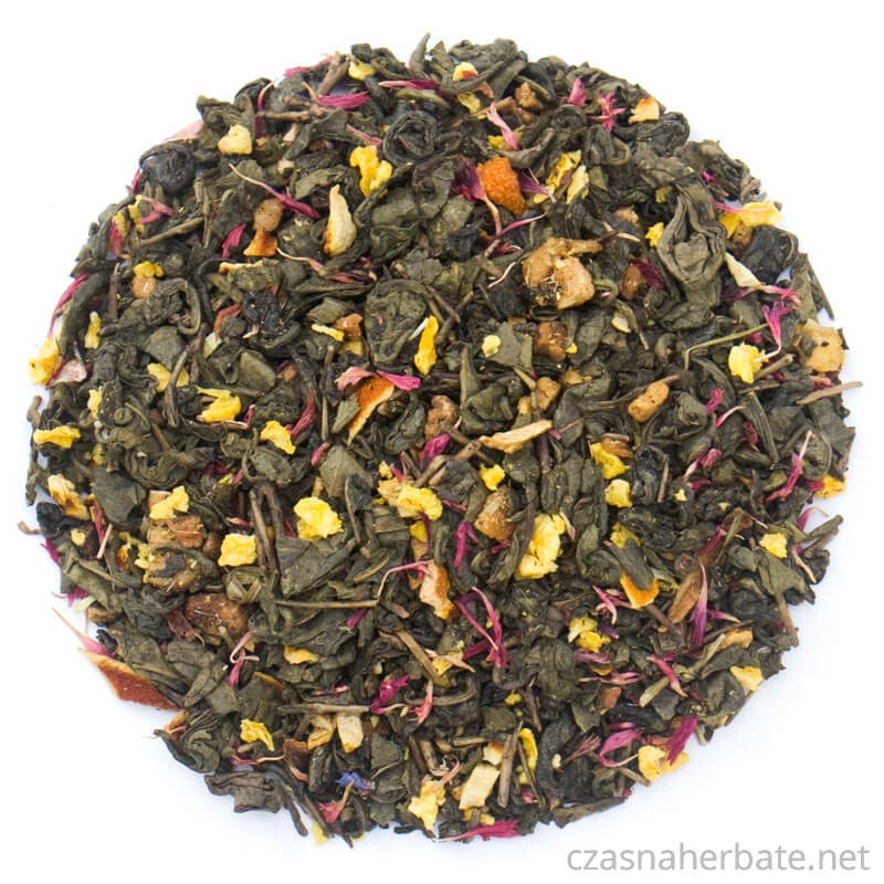 Składniki: herbata zielona Gunpowder super, skórka pomarańczowa, gruszka suszona, brzoskwinia liofilizowana, bławatek różowy, aromaty
