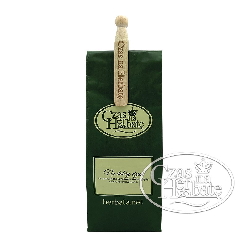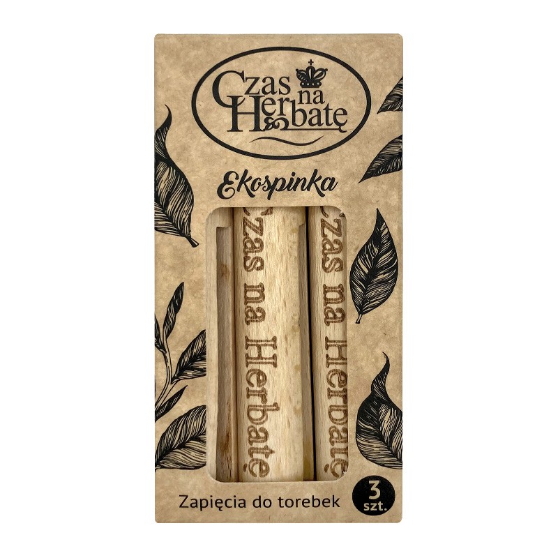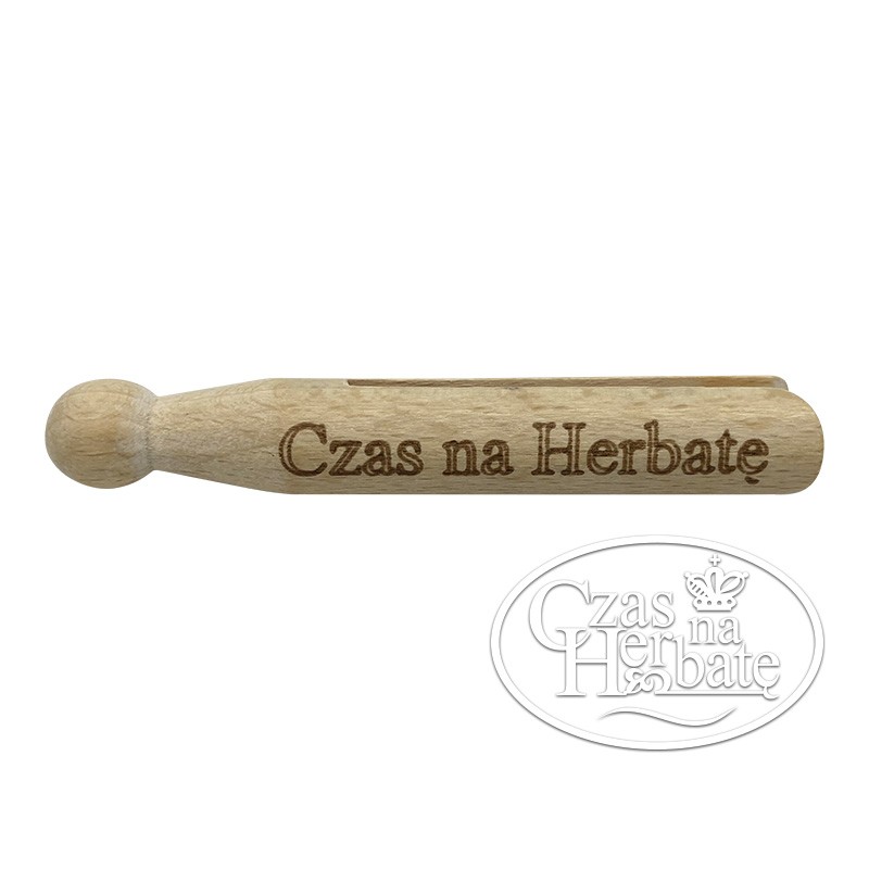 Drewniana spinka do zamykania opakowań z herbatą.