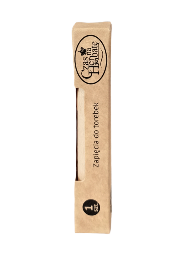Drewniana spinka do zamykania opakowań z herbatą.