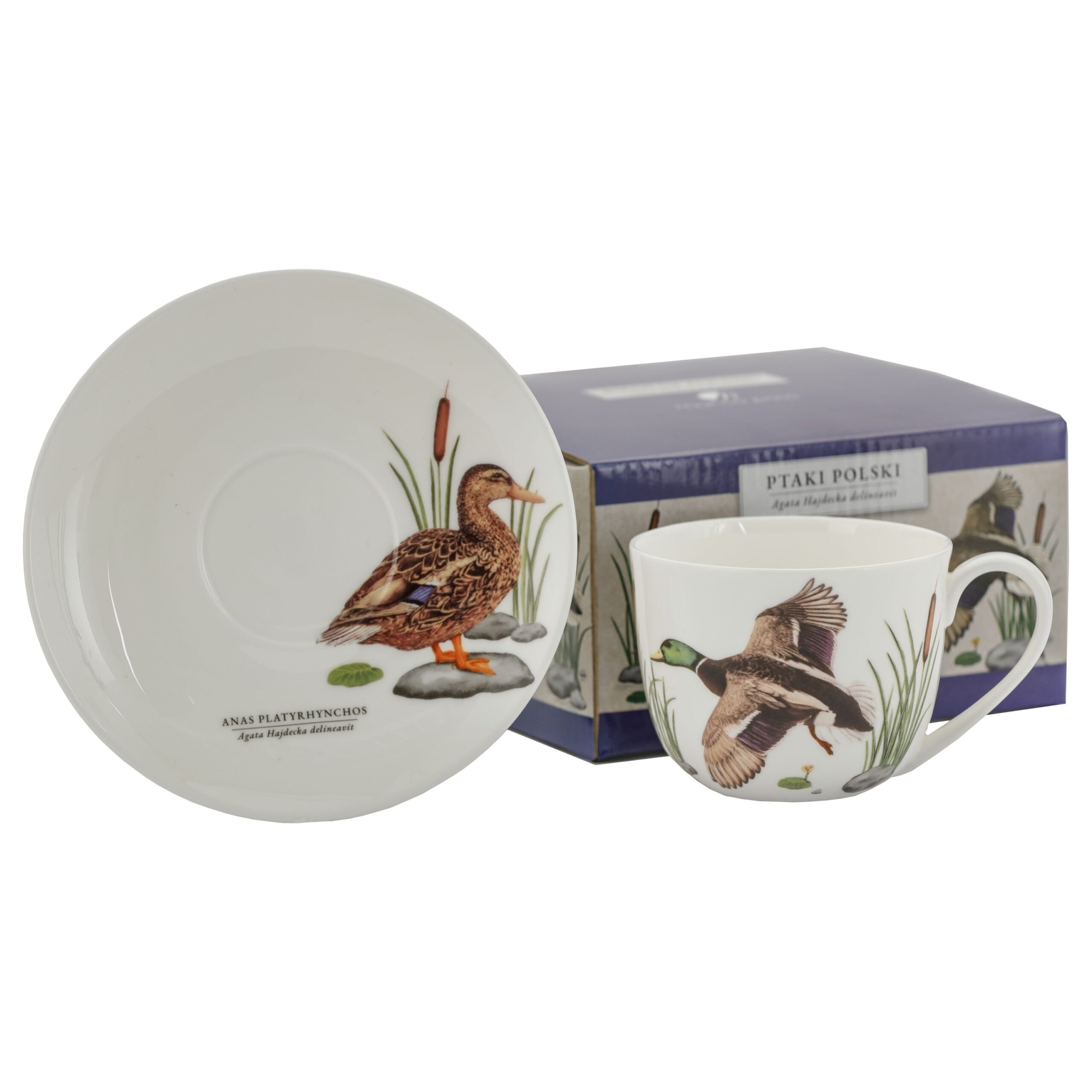 Zestaw filiżanki ze spodkiem z serii Ptaki Polski by Agata Hajdecka, wykonany z wysokiej jakości porcelany kostnej - niska waga i idealna biel marki Marco Polo. Komplet zdobiony motywem Kaczki na białym tle. Zestaw zapakowany jest w ozdobne, kolorowe pudełko, co może być doskonałym pomysłem na niebanalny prezent urodzinowy, a także podarunek dla szefa czy nauczyciela, również jako podziękowanie.
