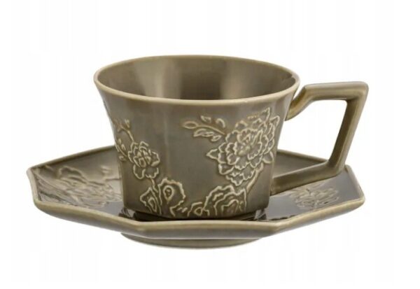 Delikatny, kwiatowy relief ozdabia zarówno filiżankę, jak i spodek, tworząc romantyczną i artystyczną kompozycję. Ośmiokątny spodek oraz geometryczny uchwyt nadają całości unikalny charakter, który przyciąga spojrzenia. Ciepły, beżowo-szary odcień z lekkim połyskiem doskonale komponuje się z każdym wnętrzem, a subtelne tłoczenia w stylu orientalnym czynią ten zestaw wyjątkowym dodatkiem do codziennego rytuału picia kawy lub herbaty.