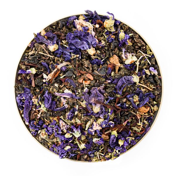 Wygląd: Wyjątkowo dekoracyjna kompozycja – skręcone liście Oolonga przeplatają się z jasnymi kawałkami suszonej gruszki oraz dużą ilością fioletowych i jasnych płatków kwiatów (fiołek, ślaz, magnolia). Całość wygląda lekko, naturalnie i bardzo elegancko.