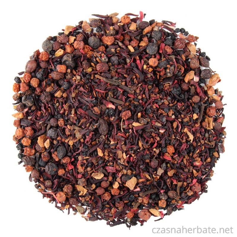Składniki: hibiskus, jarzębina, cynamon, czarny bez, głóg owoc, aronia, tarnina, goździk, jabłko, skórka róży, jagoda, aromat