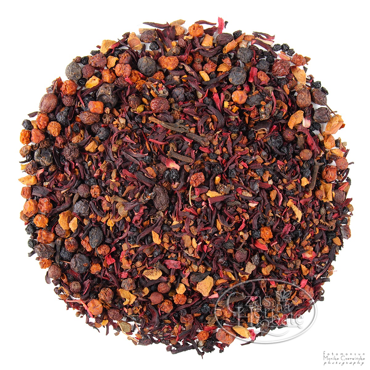 Składniki: hibiskus, jarzębina, cynamon, czarny bez, głóg owoc, aronia, tarnina, goździk, jabłko, skórka róży, jagoda, aromat