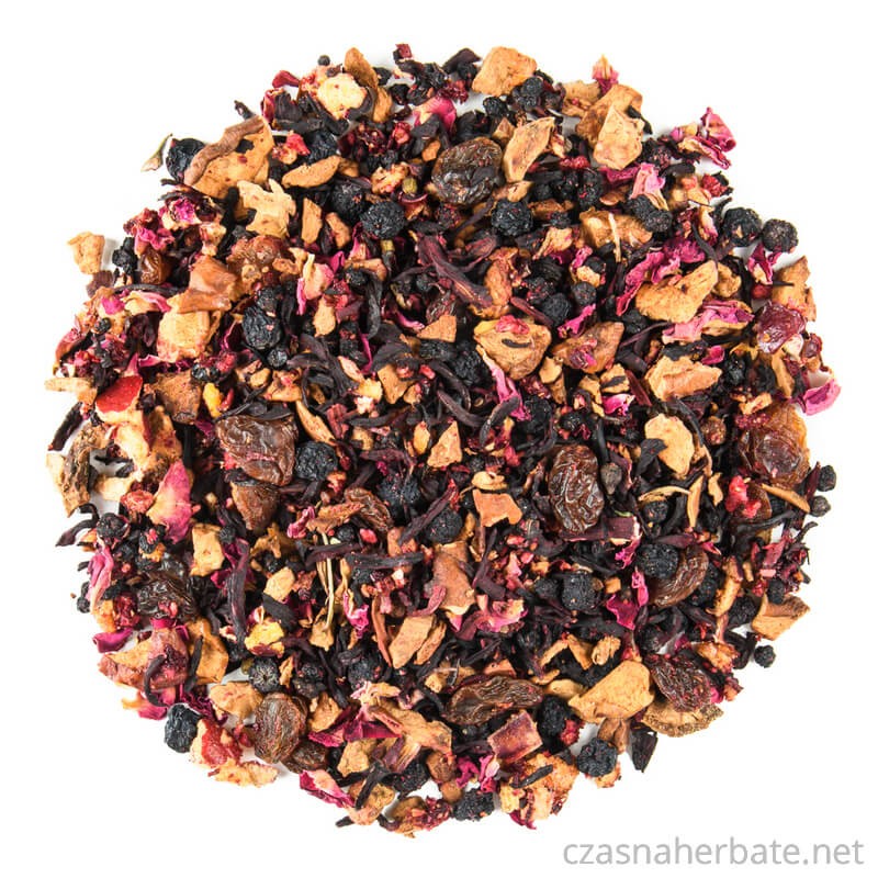 Składniki: jabłko suszone, rodzynki (rodzynki, olej roślinny), czarny bez owoc, aronia owoc, hibiskus, śliwka liofilizowana, malina liofilizowana, róża płatki, wiśnia liofilizowana, aromat