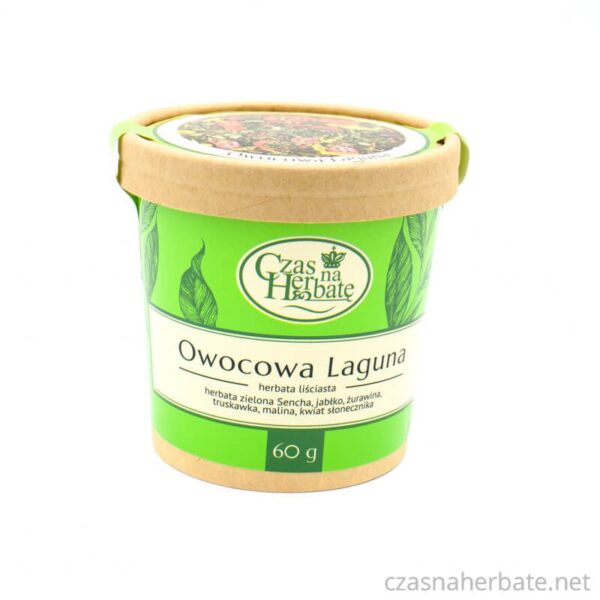 Herbaciany kubek zawiera herbatę Owocowa laguna 60g