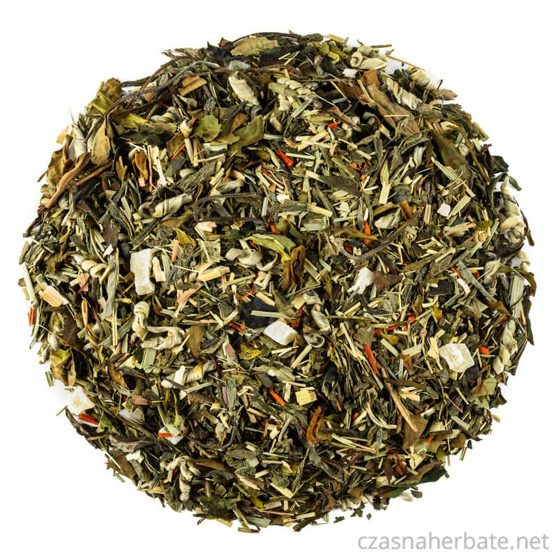 Składniki: herbata zielona Sencha, herbata biała Pai mu tan, ananas kandyzowany (ananas, cukier, kwas cytrynowy), palczatka, sandałowiec, aromat)