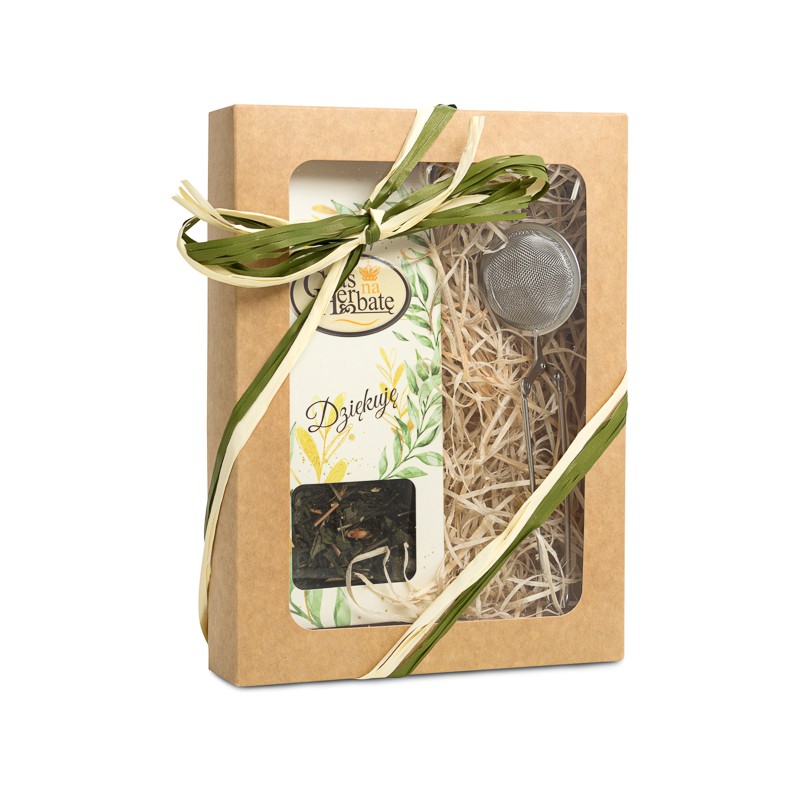 Zestaw prezentowy zawierający zieloną kompozycję oraz zaparzacz.