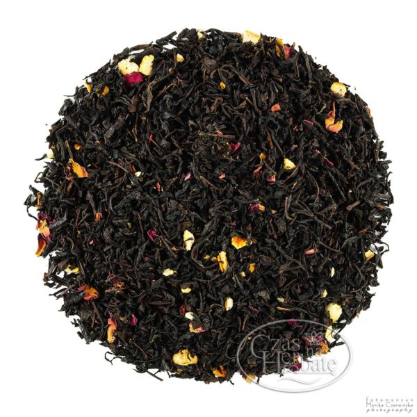 Składniki: herbata czarna OP, skórka pomarańczowa suszona, mandarynka liofilizowana 2%, płatki róży, aromaty