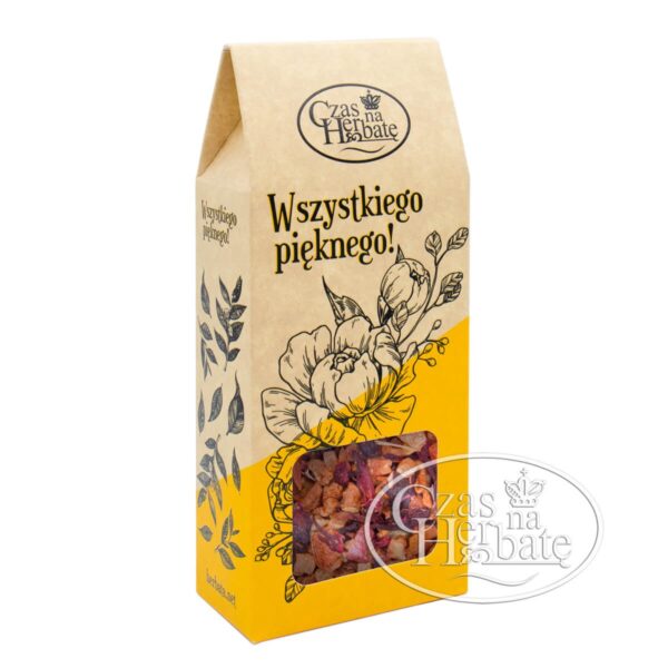 Składniki: imbir kandyzowany (imbir, cukier, kwas cytrynowy), papaja kandyzowana (papaja, cukier), mango kandyzowane (mango, cukier, kwas cytrynowy), jabłko suszone, rodzynki (rodzynki, olej roślinny), wiśnia liofilizowana, bławatek różowy, nagietek,safflowers, aromaty