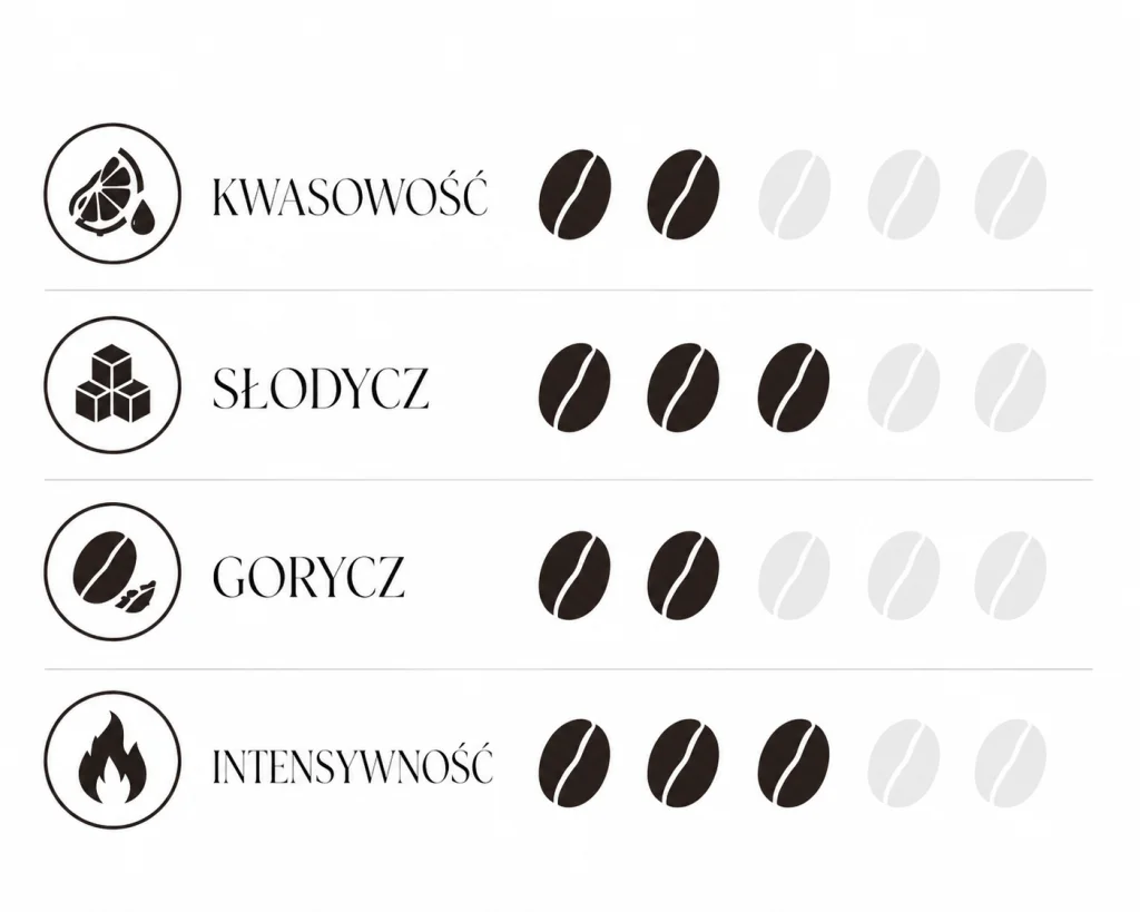 Smak: Łagodny i aksamitny, subtelna słodycz przeplata się z gładkim, kremowym body. Doskonale sprawdza się zarówno w espresso, jak i w kawach mlecznych.