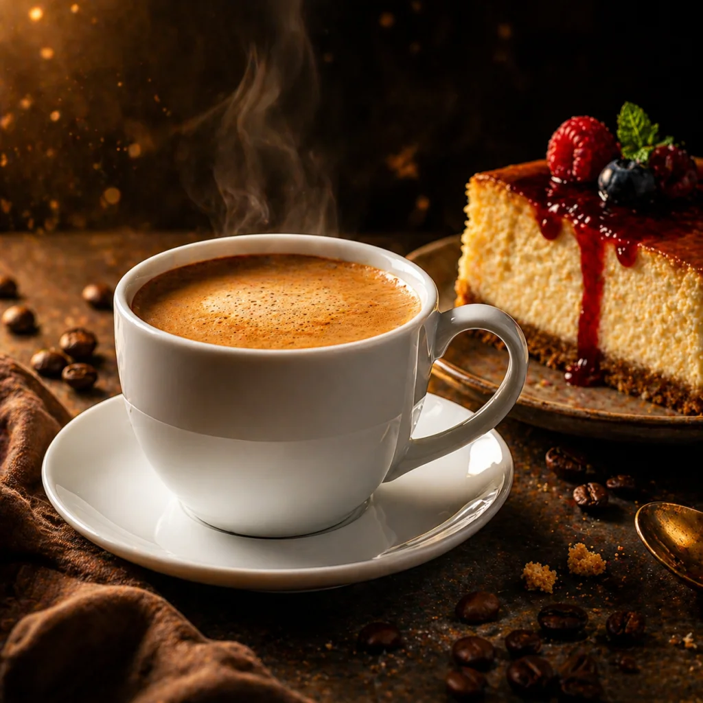 Połączenie kawy z gorącym, spienionym mlekiem tworzy aksamitny napój o wyraźnie deserowym charakterze. Smak sernika staje się jeszcze bardziej kremowy i łagodny – to idealna opcja dla tych, którzy lubią kawę w wersji „comfort” i subtelną słodycz bez dodatku cukru.