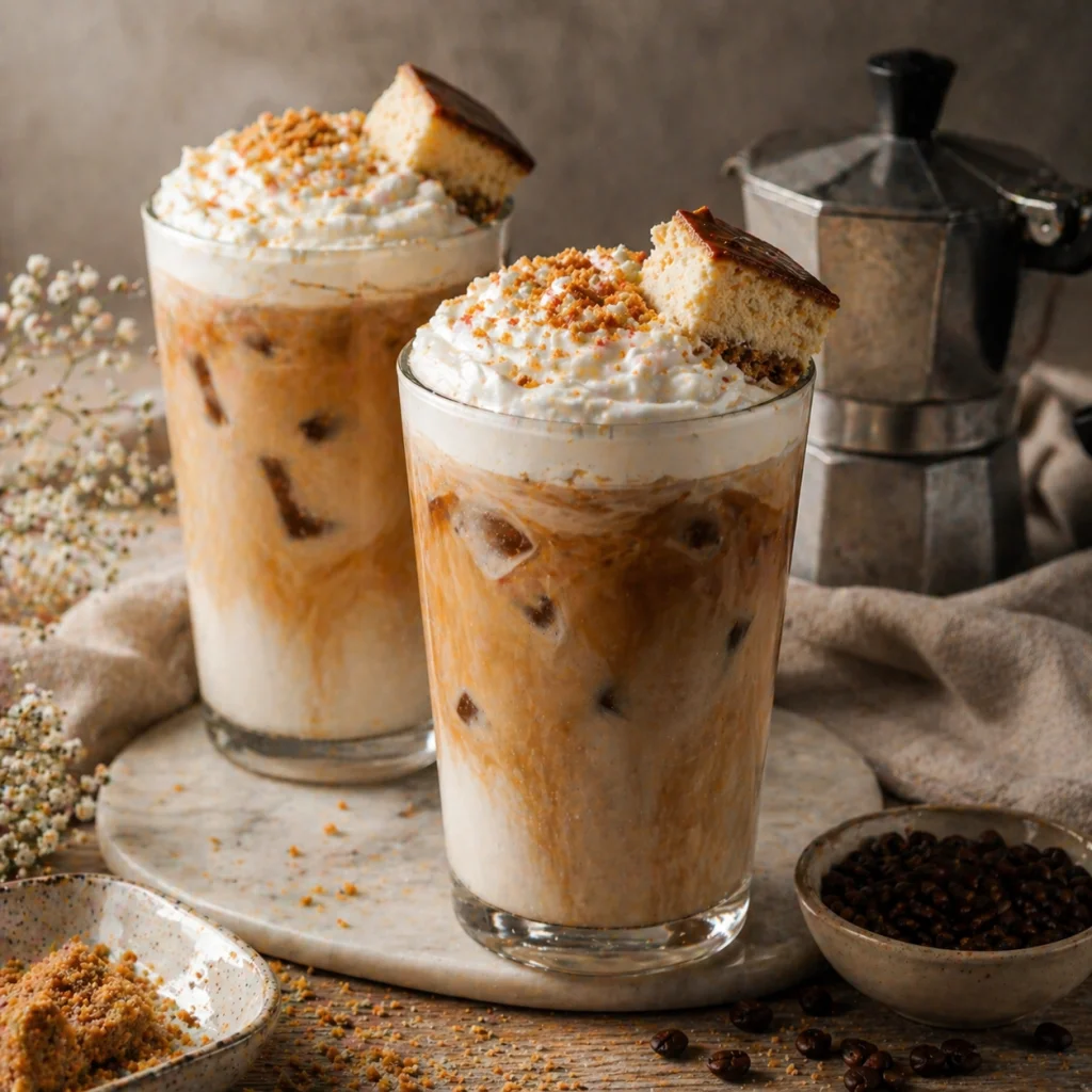 Schłodzona kawa podana z lodem i mlekiem (lub napojem roślinnym) tworzy lekką, orzeźwiającą wersję deseru. Możesz dodać kostki lodu kawowego lub odrobinę syropu waniliowego, aby podkreślić kremowy profil. Idealna na cieplejsze dni – deser i kawa w jednym.