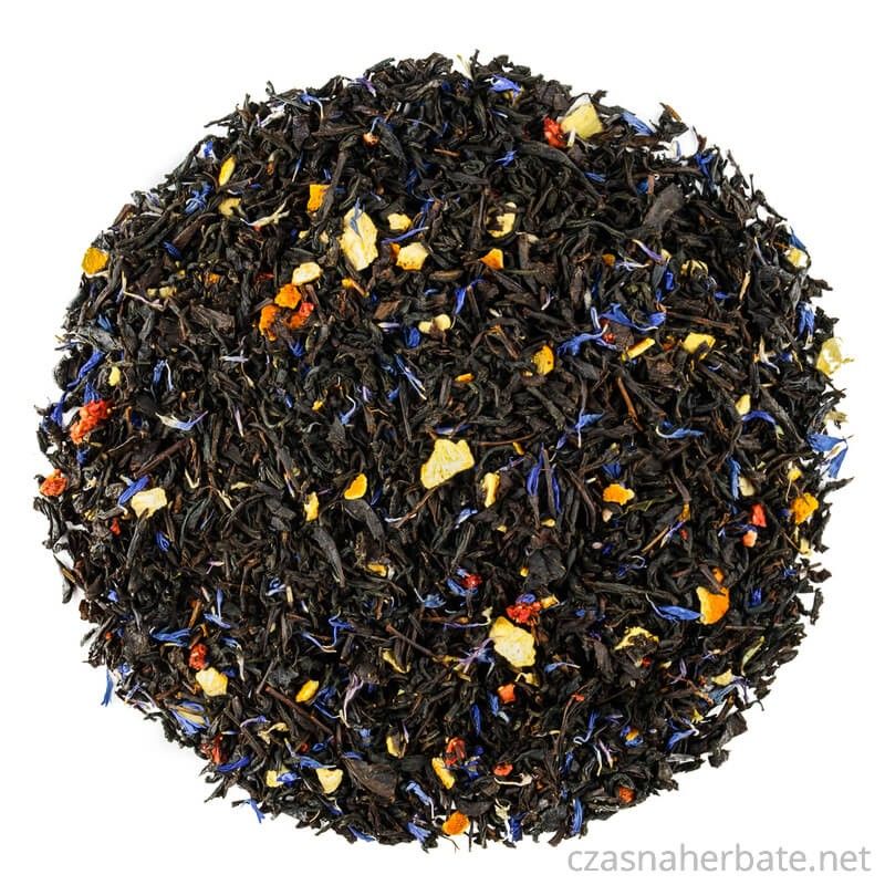Składniki: herbata czarna OP, skórka pomarańczowa suszona, truskawka liofilizowana, bławatek, aromaty
