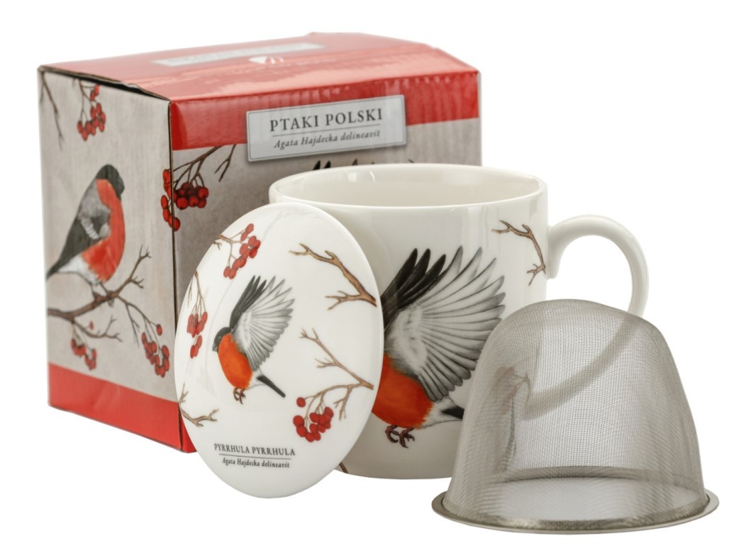 Zestaw kubek z zaparzaczem i pokrywką z serii Ptaki Polski by Agata Hajdecka. Wykonany z najwyższej jakości porcelany tzw. porcelany kostnej. Cudny kubeczek ozdobiony motywem Gila Zwyczajnego na białym tle. Kubek zapakowany jest w ozdobne, kolorowe pudełko, co może być doskonałym pomysłem na niebanalny prezent urodzinowy, a także podarunek dla szefa czy nauczyciela, również jako podziękowanie.