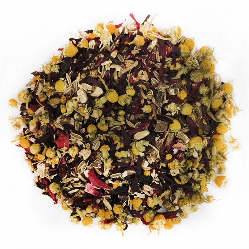Składniki: Kwiat hibiskusa, korzeń mniszka lekarskiego, owoc kopru włoskiego, koszyczek rumianku, kłącze kurkumy.
