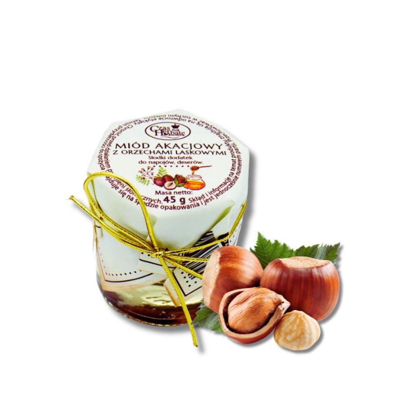 Składniki: miód nektarowy akacjowy 70%, orzechy laskowe 30%