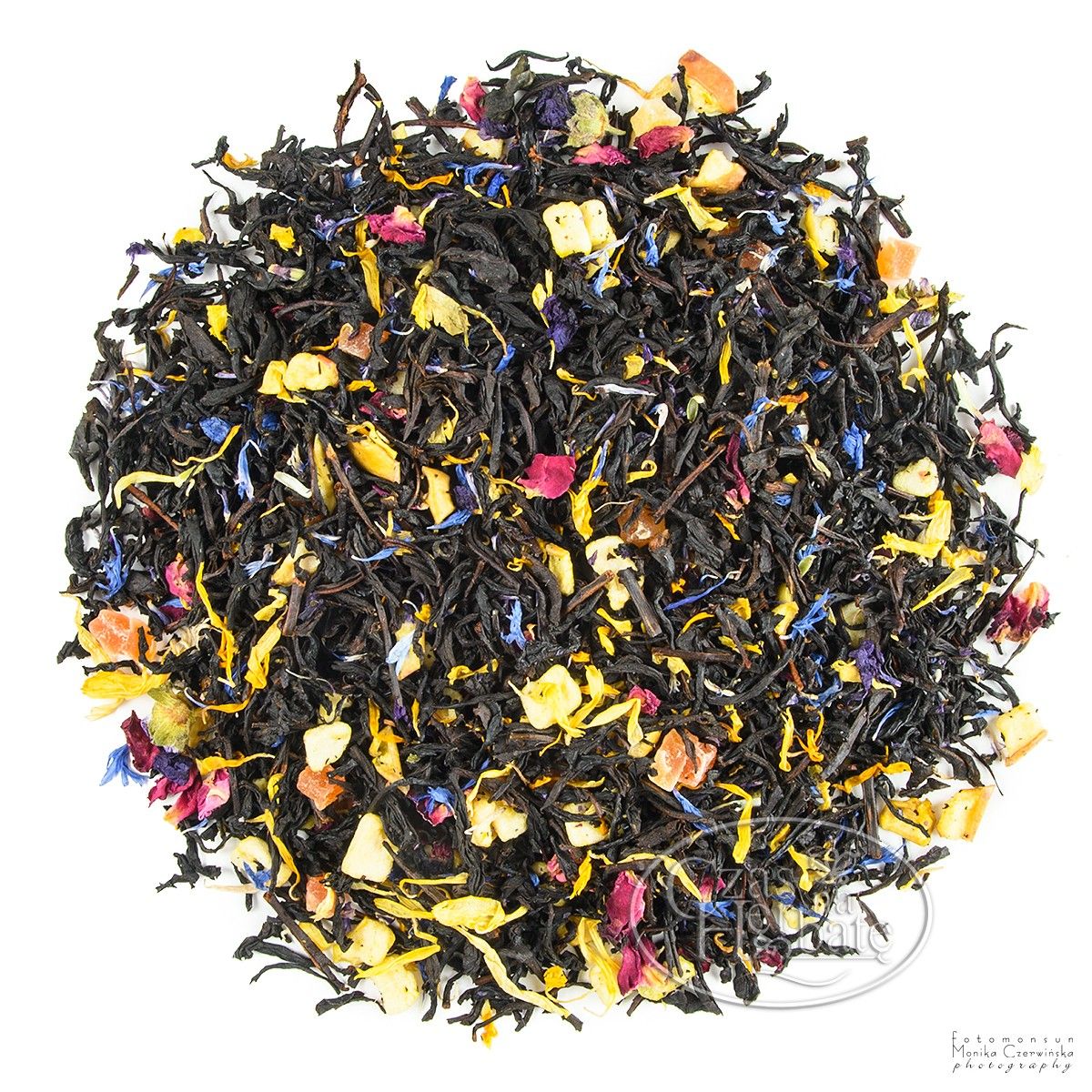 Składniki: herbata czarna Ceylon OP, papaja kandyzowana (papaja, cukier), jabłko suszone, ślaz, róża płatki, nagietek, bławatek, aromat