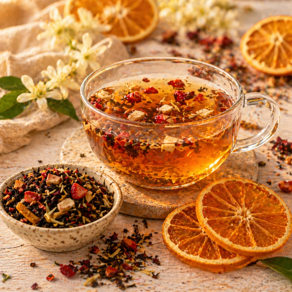 Składniki: herbata czarna OP, trawa cytrynowa, jabłko suszone, pomarańcza suszona 7%, truskawka liofilizowana, hibiskus, kwiat pomarańczy 3%, aromaty