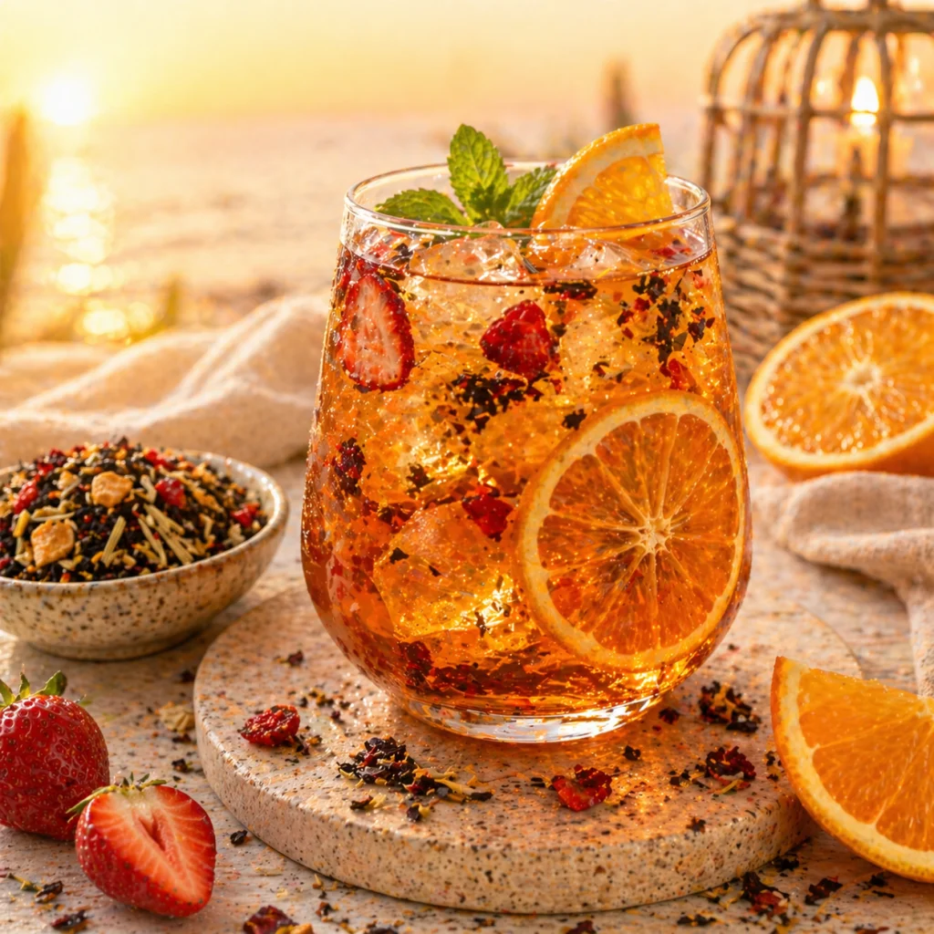 Bajecznie kolorowa, a także absolutnie aromatyczna kompozycja, która już podczas otwarcia torebki zachwyci swoim wyglądem i zapachem. Soczyste plasterki truskawek i pomarańczy oraz cząsteczki jabłka cudownie kontrastują ze słomkową trawą cytrynową i rubinowymi płatkami hibiskusa. Całość tworzy bardzo orzeźwiający napar, który doskonale smakuje na ciepło, a także na zimno z kostkami lodu oraz kawałkami świeżych owoców.