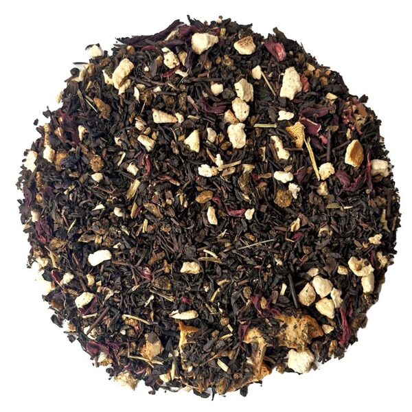 Wygląd: Kolorowa i efektowna mieszanka: ciemne liście Pu Erh kontrastują z pomarańczowymi i czerwonymi składnikami – suszoną pomarańczą, hibiskusem, miętą i grejpfrutem. Po zaparzeniu napar ma intensywny, bursztynowo-czerwony kolor.
