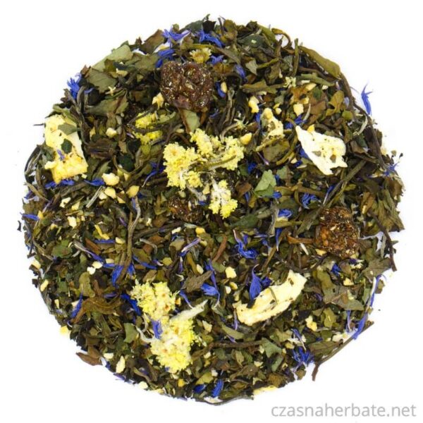 Herbata biała Pai Mu Tan z dodatkiem ananasa, marakui, jagód inkaskich, kocanki i bławatka.
