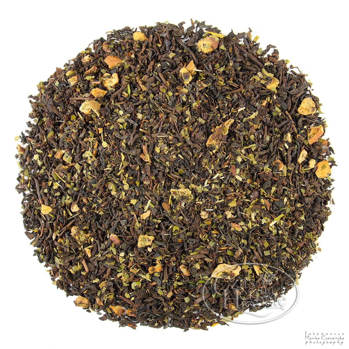 Składniki: herbata czerwona Pu erh 63,3%, yerba mate, jabłko suszone, wiśnia liofilizowana, nagietek 0,7%, aromaty