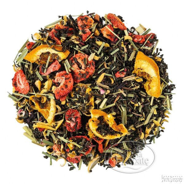 Składniki: herbata czerwona Pu erh 60%, trawa cytrynowa, truskawka liofilizowana, jabłko suszone, pomarańcza suszona 7%, kwiat pomarańczy, hibiskus kwiat, aromaty