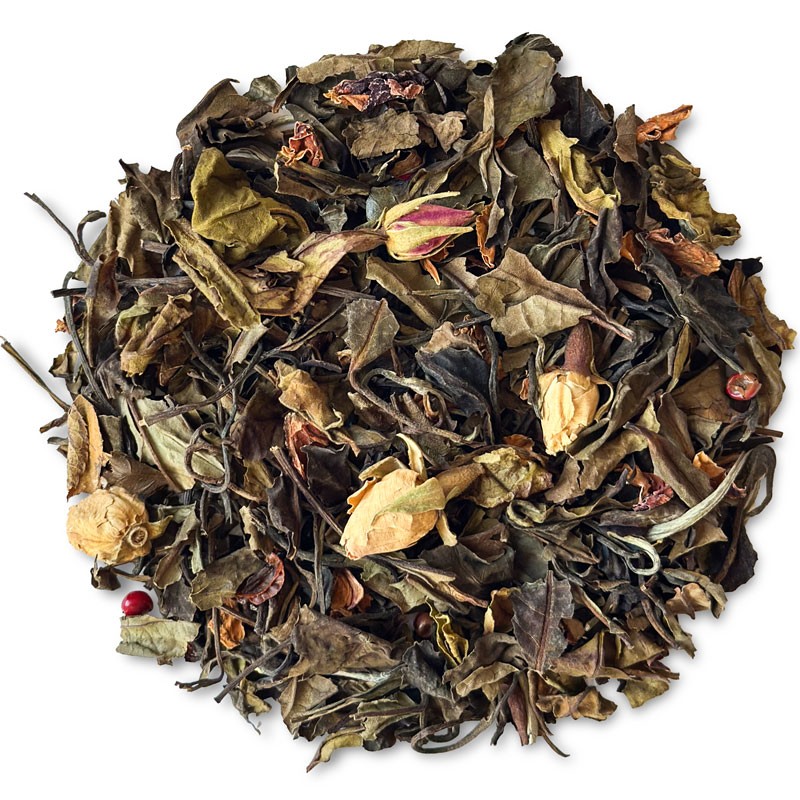 Skład: herbata biała Pai Mu tan 78%, skórka owocu dzikiej róży, płatki i pąki róży, pieprz czerwony, imbir, aromat