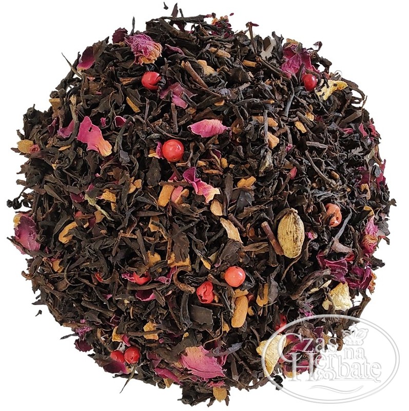 Składniki: Herbata czarna OP, skórka pomarańczowa, cynamon, róża płatki, pieprz czerwony, kardamon.