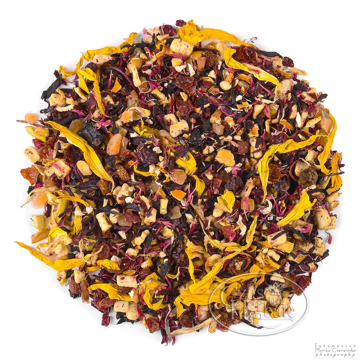 Składniki: hibiskus kwiat, jabłko suszone, skórka owocu dzikiej róży, mango kandyzowane (mango, cukier, kwas cytrynowy), skórka pomarańczowa suszona, wiśnia liofilizowana, bławatek różowy, słonecznik kwiat, aromaty