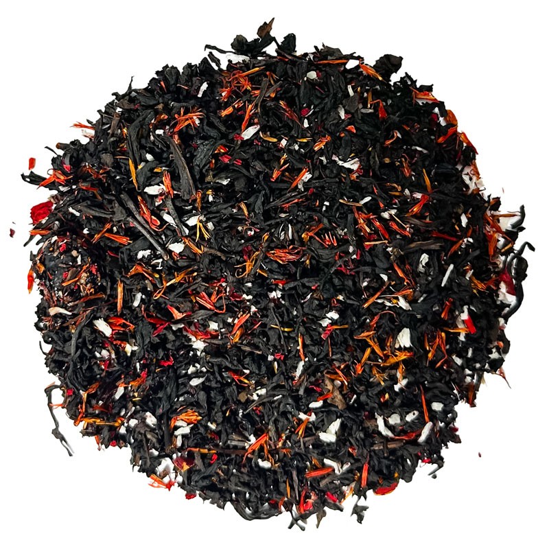 Składniki: Herbata czarna Ceylon HG, wiśnia kandyzowana, wiórki kokosowe, wiśnia liofilizowana, saflor, aromat.
