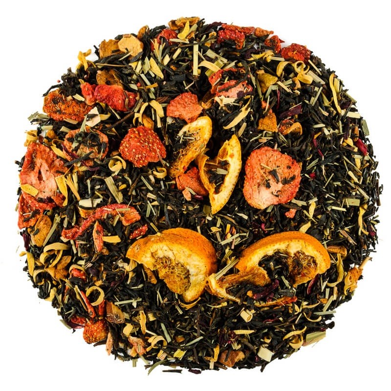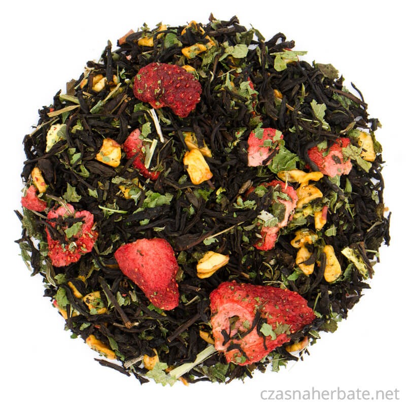 Casablanca - czarna herbata Ceylon High Grown z dodatkiem melisy oraz kawałków jabłek, truskawek i ananasa w połączeniu z naturalnymi aromatami truskawki i ananasa.