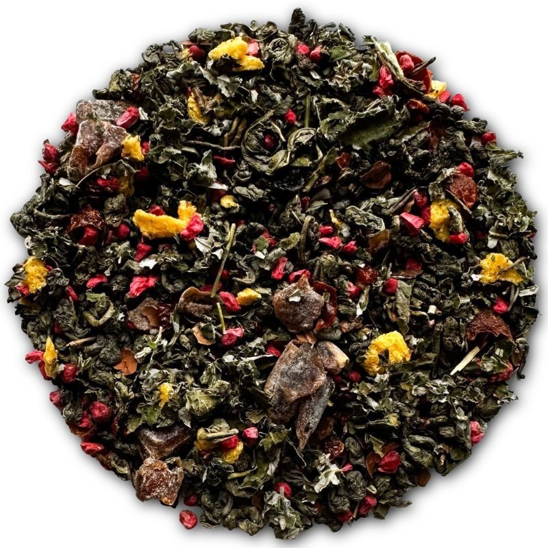 Tajemnica Świąt - zielona herbata Gunpowder z dodatkiem daktyli, malin, kakaowca oraz pomarańczy.