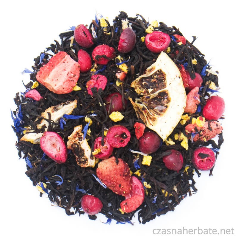 Casablanca - czarna herbata Ceylon High Grown z dodatkiem melisy oraz kawałków jabłek, truskawek i ananasa w połączeniu z naturalnymi aromatami truskawki i ananasa.