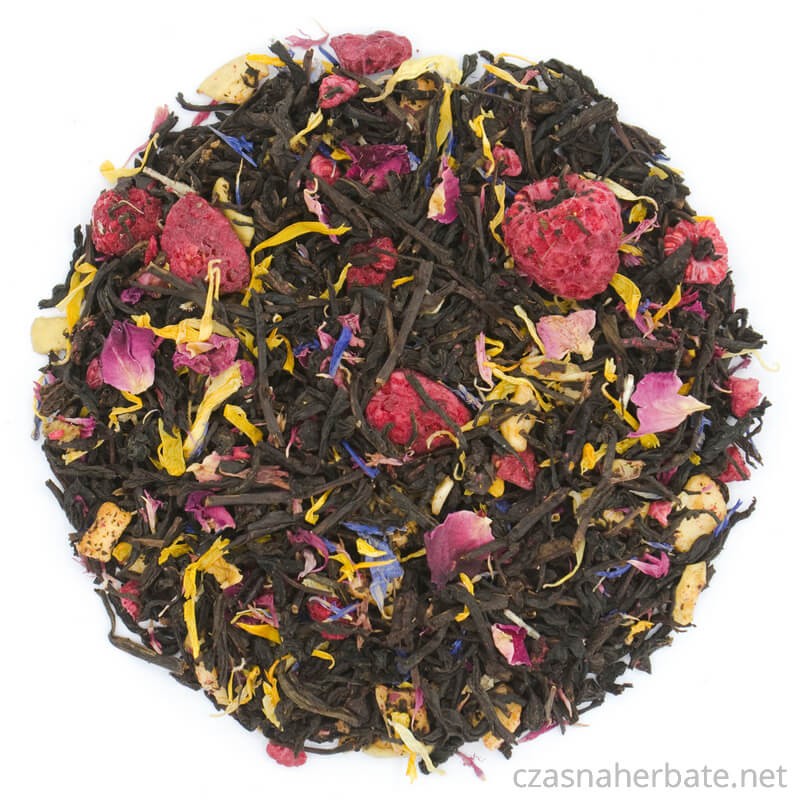 Imię róży - czarna herbata cejlońska z dodatkiem jabłka, maliny, płatków róży, bławatka oraz nagietka.